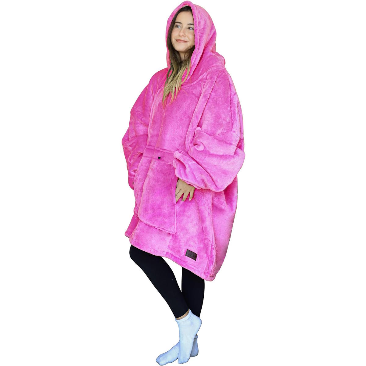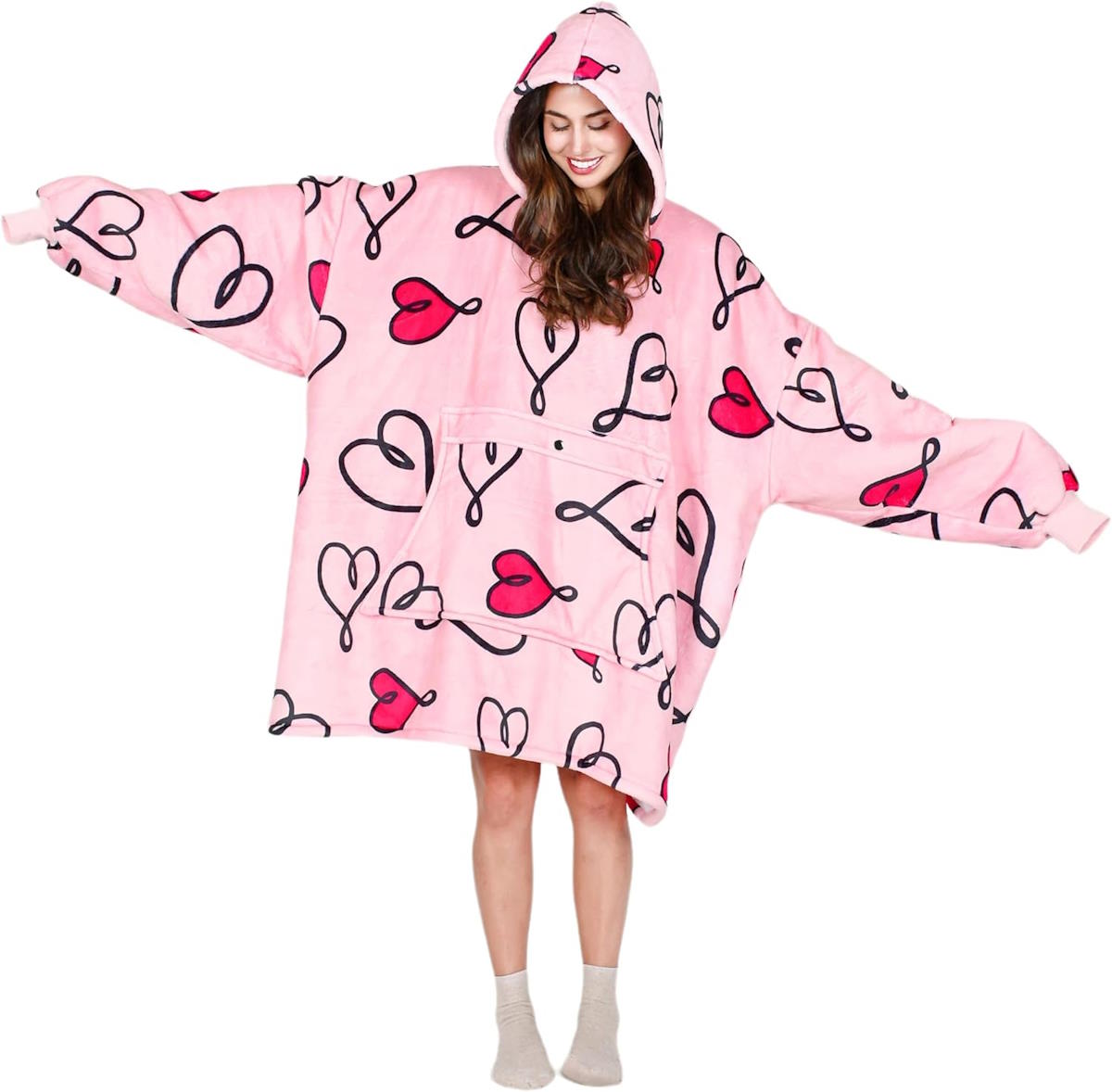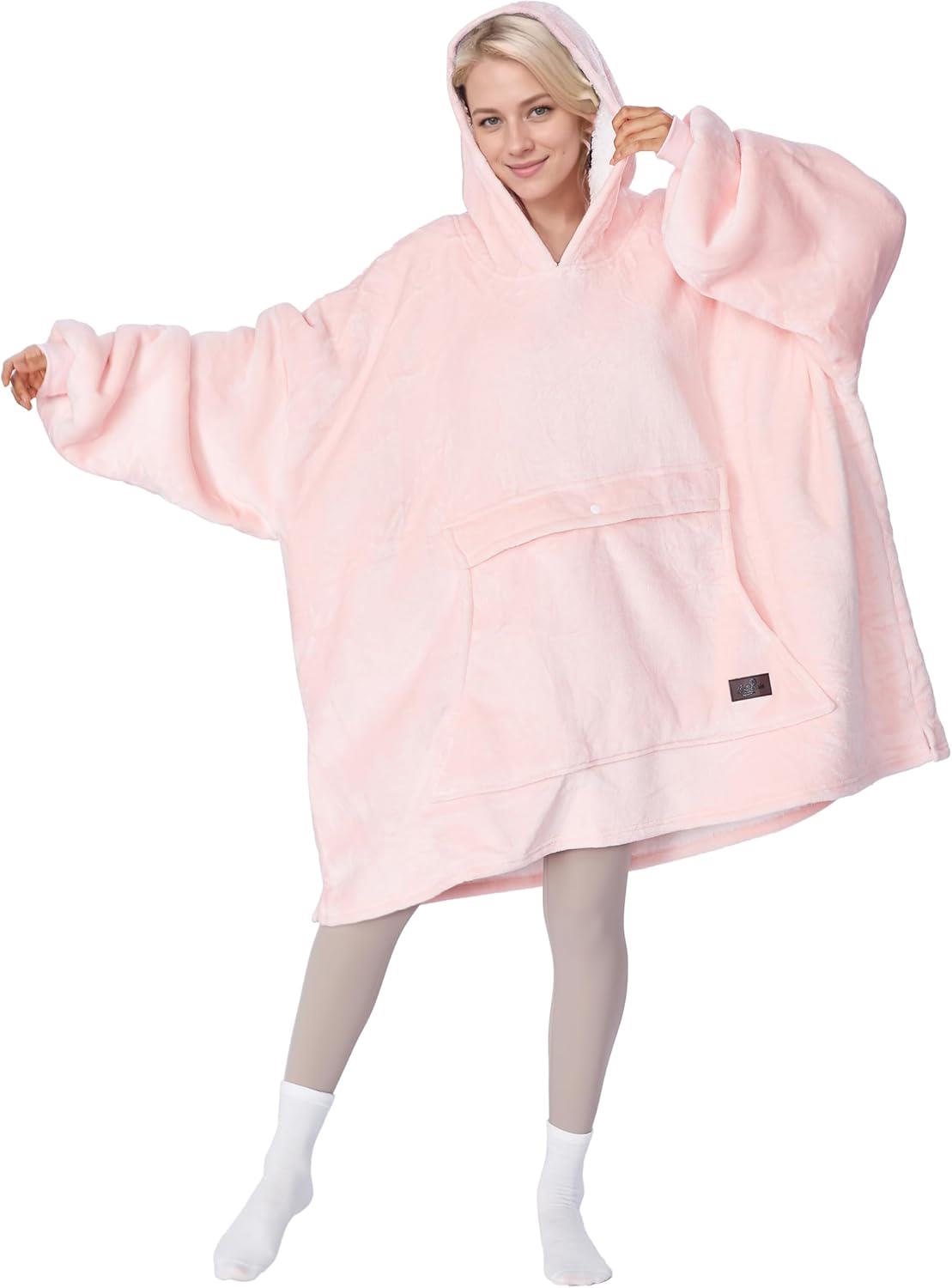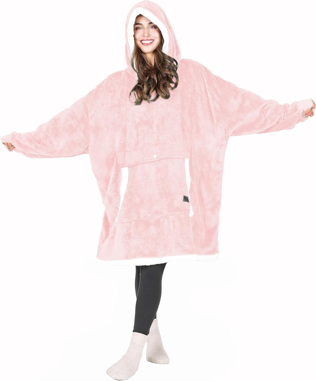 This oversized Tirrinia wearable blanket hoodie offers extreme coziness with its two-layer design. The outer layer is lightweight plush microfleece, while the inside lining is fluffy and comfortable sherpa. It keeps you warm and allows you to easily tuck your legs into the wearable blanket. The hoodie comes in multiple pink variants, besides other colors.